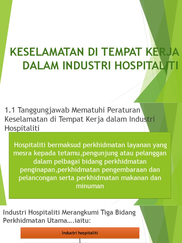Dalam pengurusan keselamatan tapak bina pelbagai kos diperuntukkan bagi menjamin tahap keselamatan yang mencukupi dan bagi menjamin pelaksanaan kerja di tapak bina tidak diganggu akibat kejadian kemalangan Mac Collum 1993. DALAM INDUSTRI HOSPITALITI 11 Tanggungjawab Mematuhi Peraturan Keselamatan di Tempat Kerja dalam Industri Hospitaliti. Menggalakkanpersekitaranyang sesuai dari segi fisiologi dan psikologi 4.